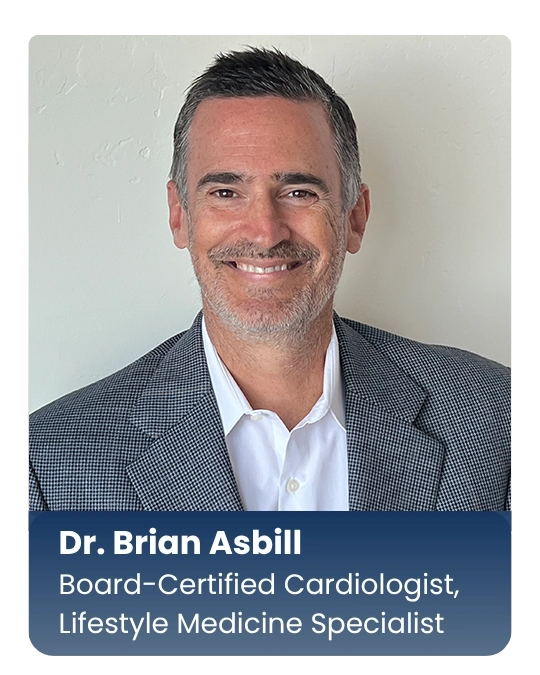 Dr. Asbill specializes in adult cardiology with clinical interests in non-invasive cardiology. He has spent many years treating patients with lifestyle-related chronic illnesses that have led to cardiovascular disease. 10 years into his 20-year cardiology career, he began the transition from managing heart disease to attacking the root cause through lifestyle intervention and education.